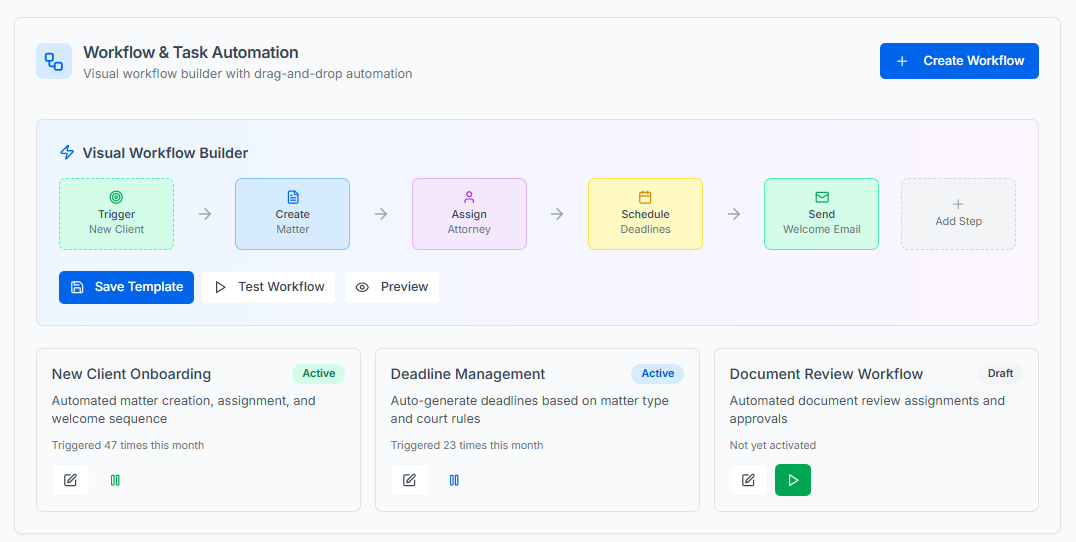 Build workflows that assign tasks, send alerts, trigger messages, and create deadlines — based on your firm’s process.