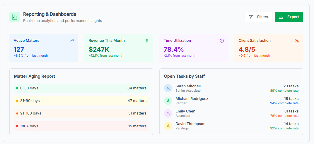 Track time, billing, matter volume, staff activity, and more — with built-in dashboards and customizable reports.