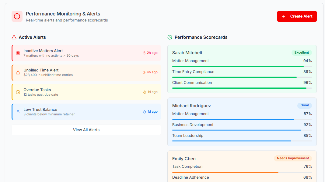 Flag inactive matters, overdue tasks, or workload bottlenecks.