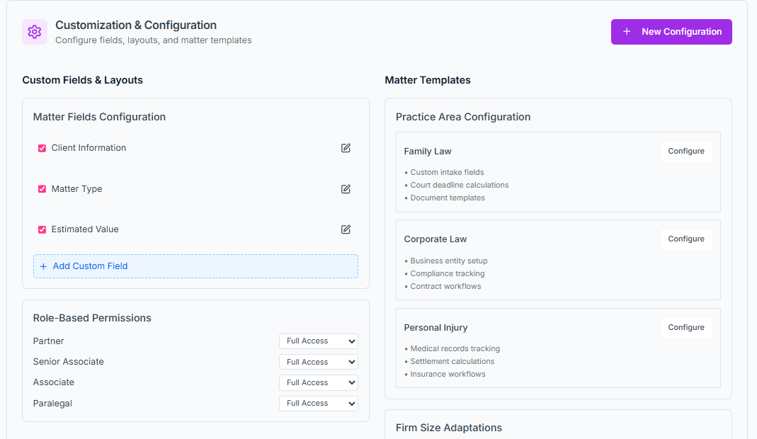 Every firm is different. Oxygen lets you configure workflows, user roles, matter types, and reporting without custom dev work.