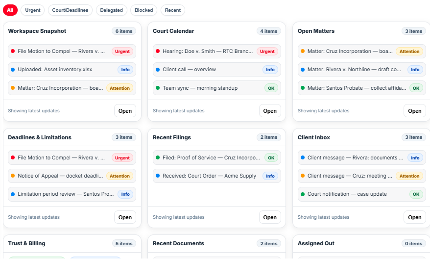Your management dashboard brings revenue, workload, risk, and client activity into a single live view—secure, configurable, and built for the way your firm runs.