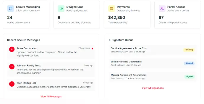 Secure messaging, file uploads, e-signatures, and billing — all in one place.